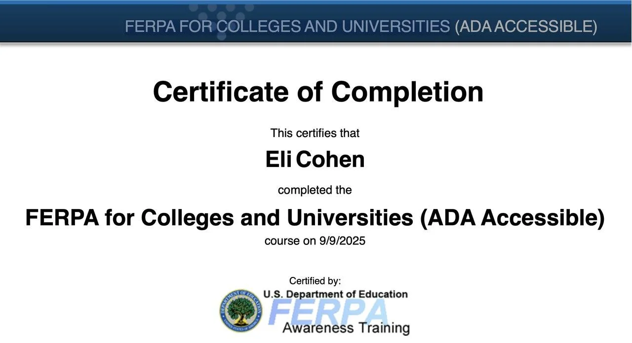 I am certified in Family Educational Rights and Privacy Act compliance. This includes the proper use of student educational records, privacy protection protocols, and confidentiality requirements in educational settings.